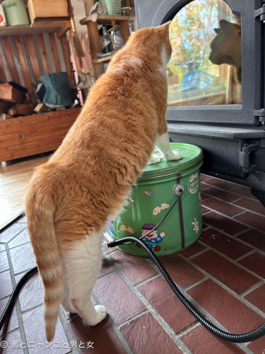 今朝方の外気温は マイナス1℃やったみたい。 「まっちゃん」が灰入れに使ってる缶かんに手をのせてる。じんわりあったかい缶で手を温めてるのか? ···