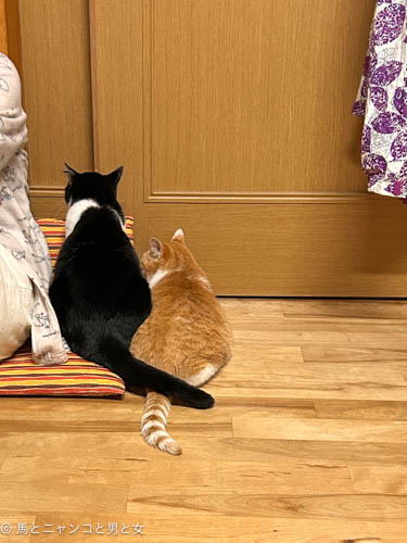 昨晩の「母ちゃんの横争奪戦」の様子。 「まっちゃん」が良い席を取ってたがマーボーが間に割って入って勝負あり。更に尻尾で「まっちゃん」の動き···
